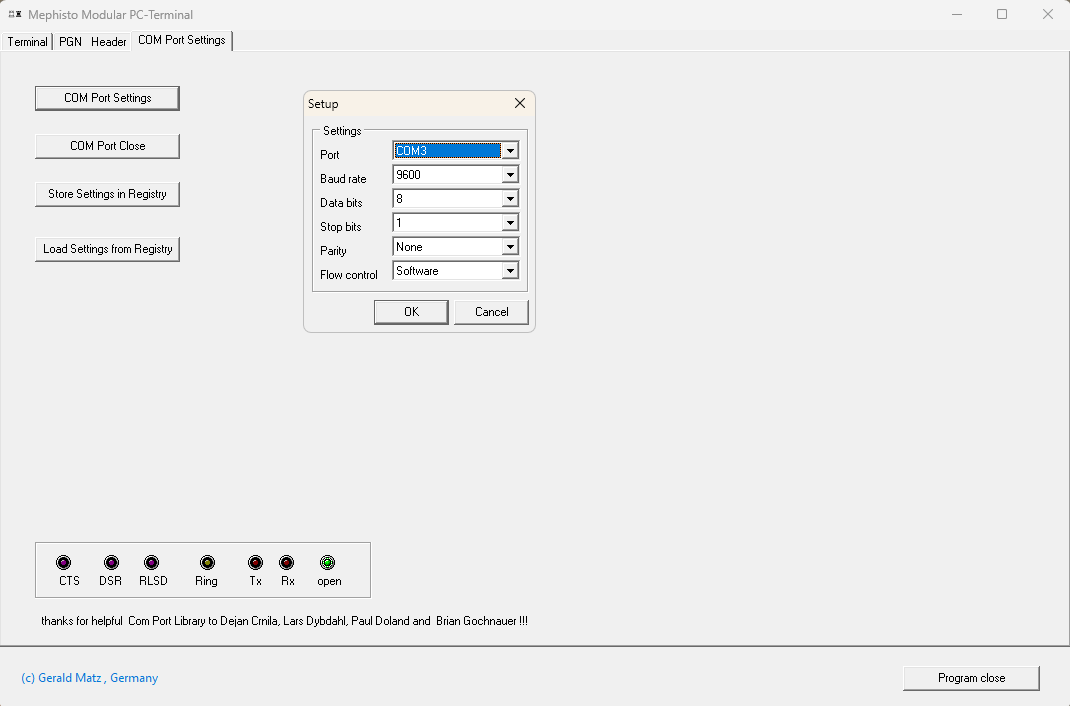 Bei den vielen Testpartien die ich prüfen musste, war mir das umherkopieren in eine PGN Vorlagendatei zu aufwendig und ich habe mir einen eigenen speziellen seriellen Monitor mit PGN Datei Speicherung in Delphi programmiert. (nur für Windows und kostet 24 € ( Brutto)! )